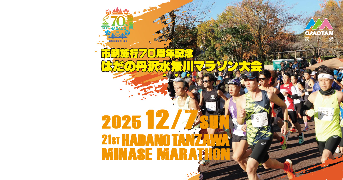 2025年12月7日(日)に開催される「市制施行70周年記念 第21回はだの丹沢水無川マラソン大会」の【公式】サイトです。当サイトではコースマップ、エントリー情報などご覧いただけます。